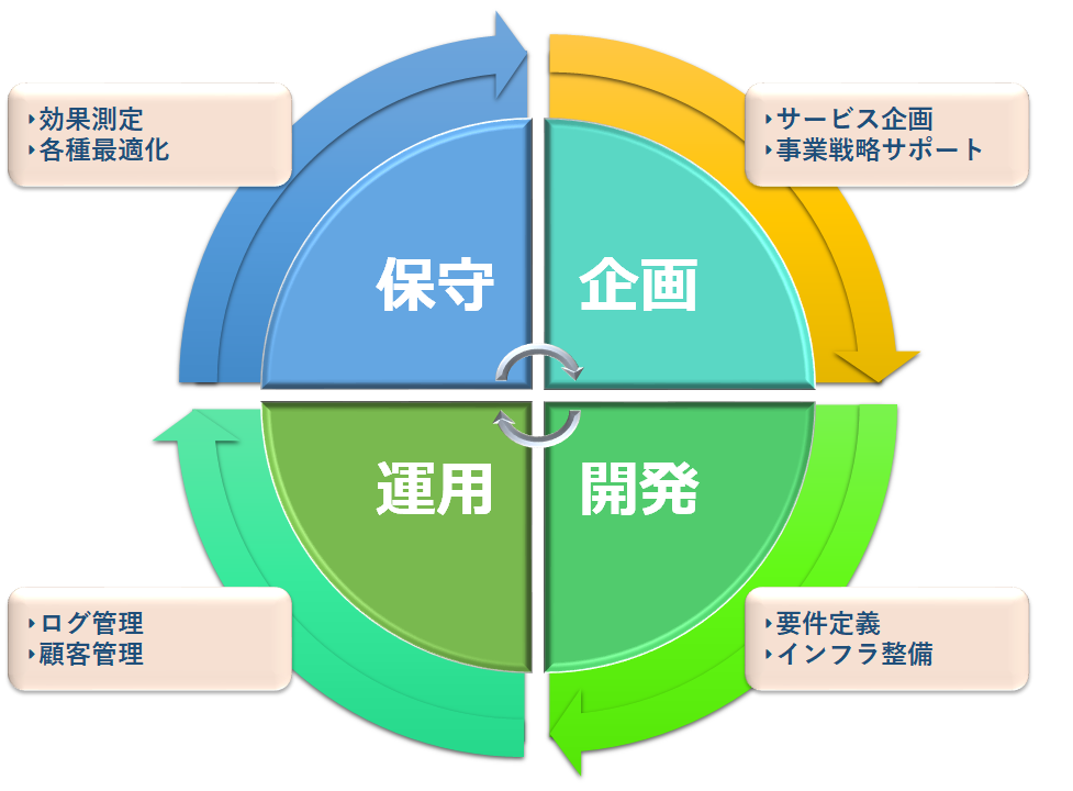 サービスの企画から開発、実装、運用保守及び改善提案までワンストップでサポートいたします。
